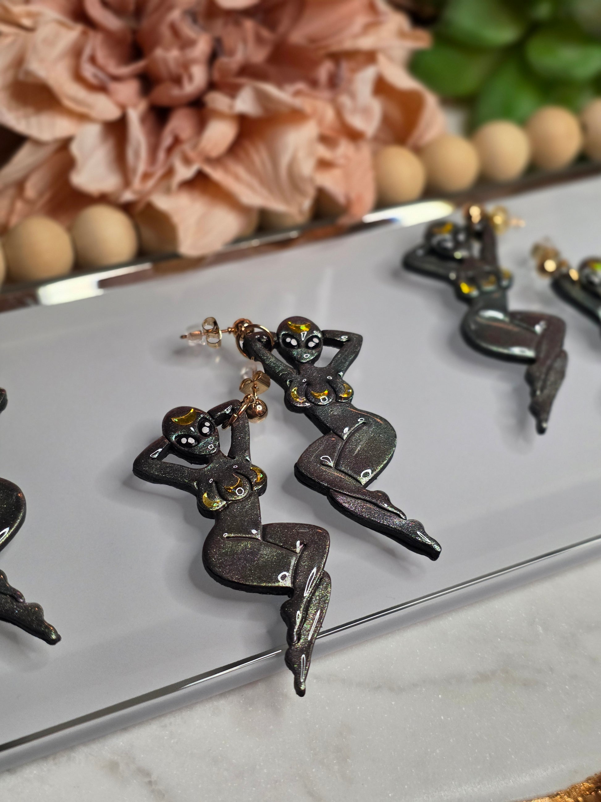 Abduct the spotlight with these out-of-this-world alien babe earrings! Fusing classic sci-fi vibes with a touch of pin-up glamour, each earring features a stylized alien figure in a dynamic, cosmic pose. They are handcrafted from polymer clay and coated in a mesmerizing glitter finish that shifts and sparkles with every movement.