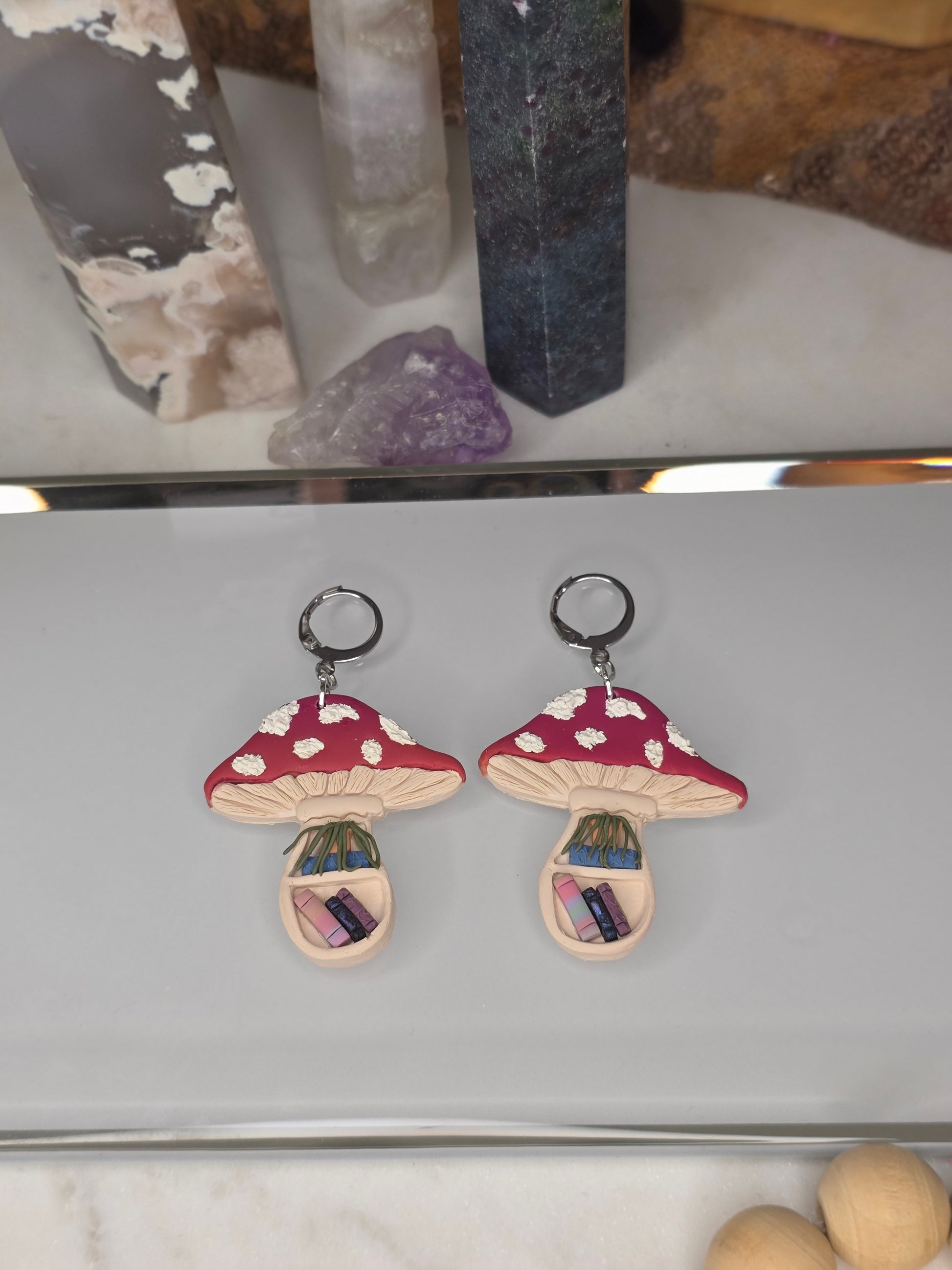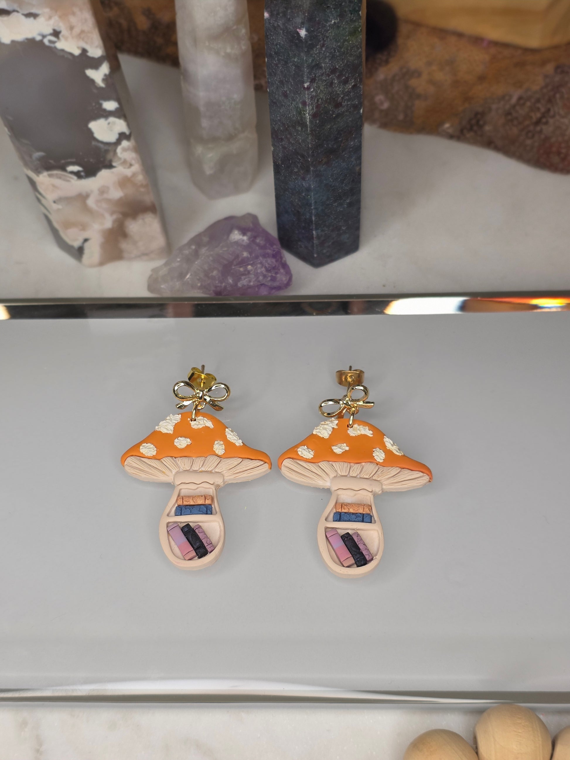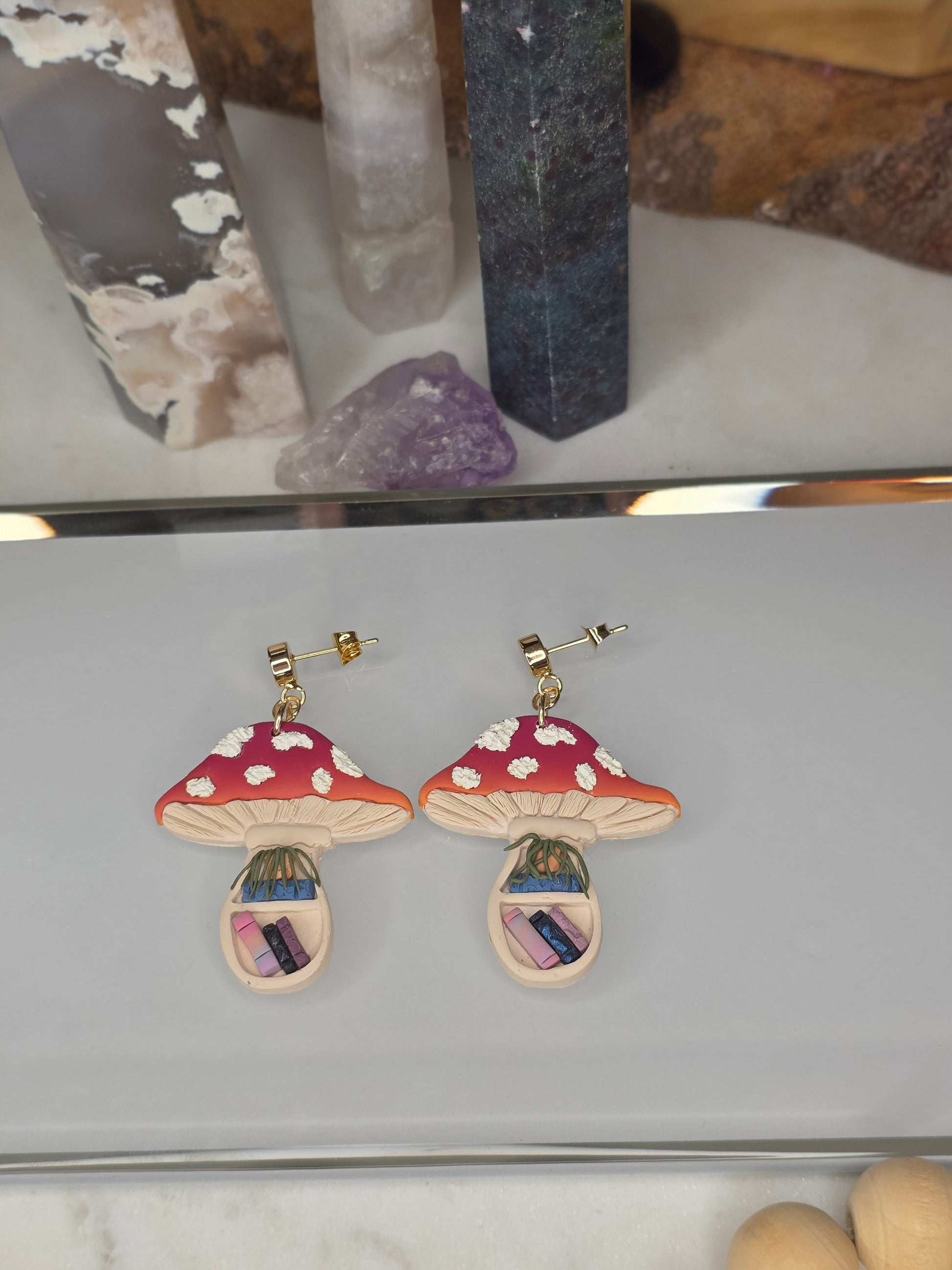 Step into a whimsical world with our "Mushroom Library" earrings! Each pair is a tiny, fantastical library hidden beneath a beautifully detailed mushroom cap. Lovingly crafted from lightweight polymer clay, these earrings feature miniature books nestled on shelves, ready for your next adventure. They’re a magical accessory for the cottagecore enthusiast, the fantasy reader, or anyone who finds joy in the quiet corners of a good book.