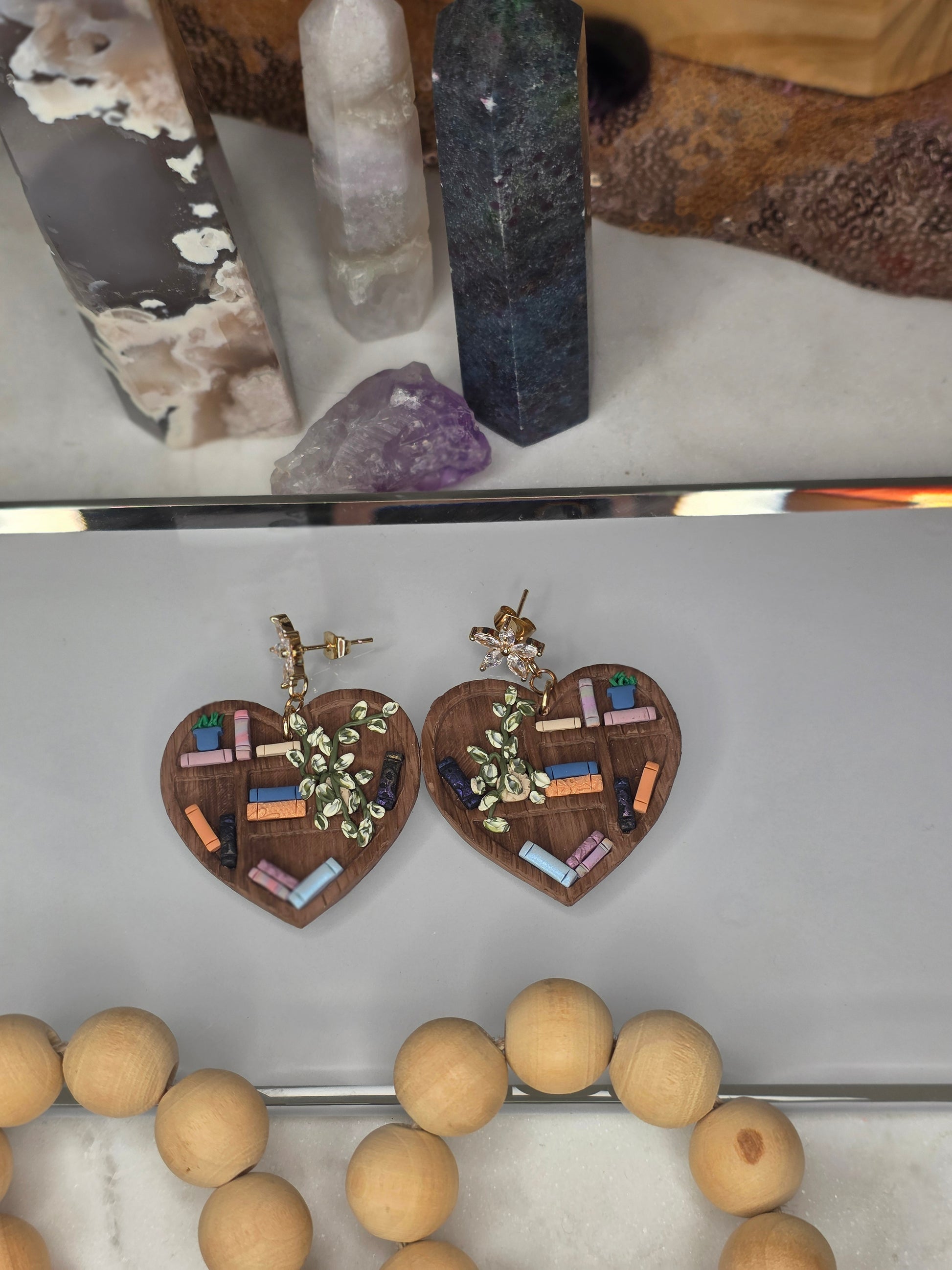 Wear your heart on your lobes with our "Literary Heart" earrings! These charming earrings are meticulously handmade from lightweight polymer clay, featuring a heart-shaped bookshelf filled with tiny, detailed books and a cute plant. They're a perfect tribute for anyone who believes a good story is at the heart of everything. Light and comfortable for all-day wear, these are an ideal accessory for book lovers and quiet moments with a favorite novel.