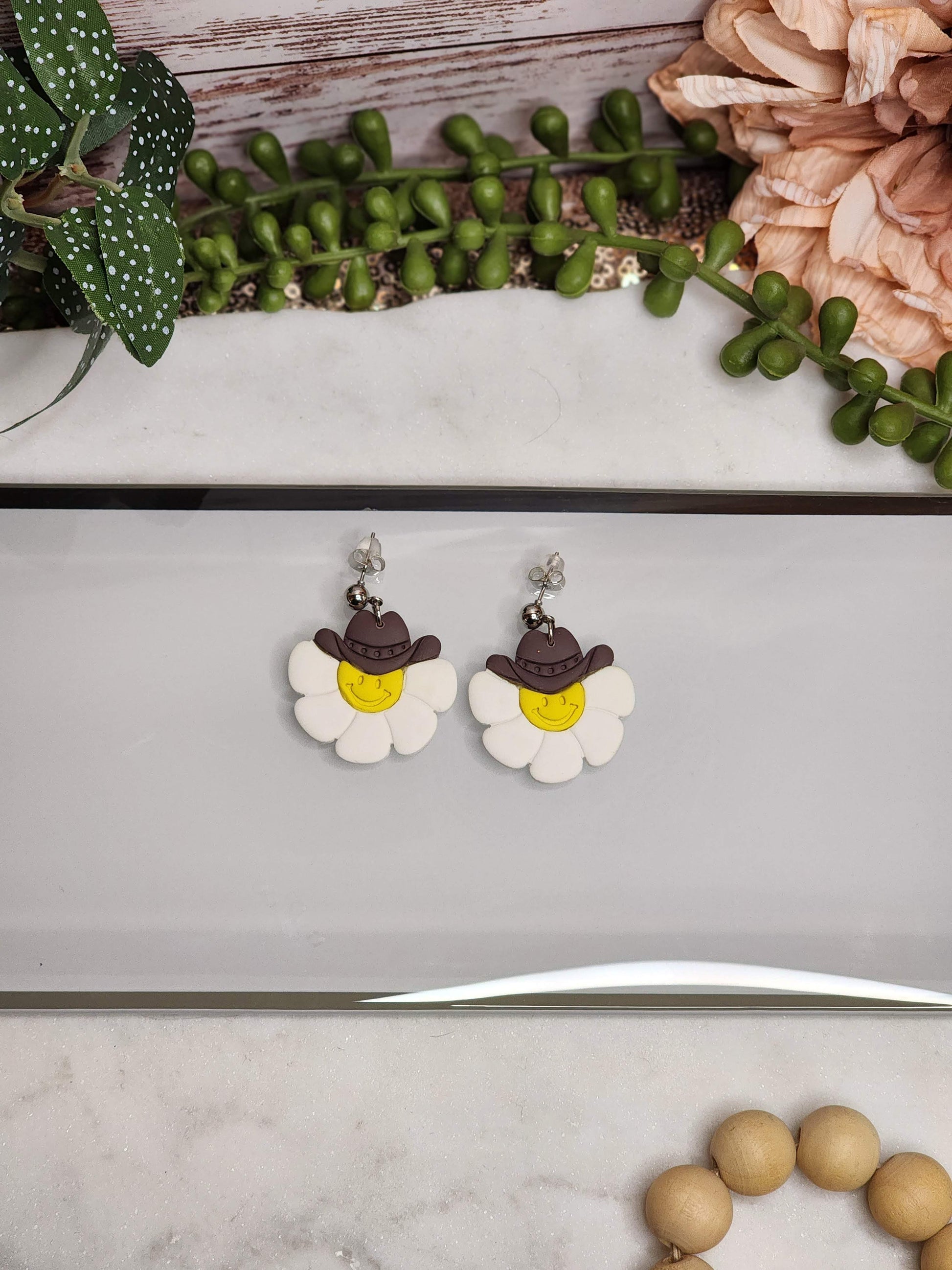 Say 'howdy' to your new favorite accessory! These ridiculously cute dangle earrings are guaranteed to bring a smile to your face. Handcrafted from lightweight polymer clay, each earring features a cheerful daisy with a happy smiley-face center, all topped off with a little brown cowboy hat. They're a fun and whimsical way to add a touch of sunny, Western charm to your day.