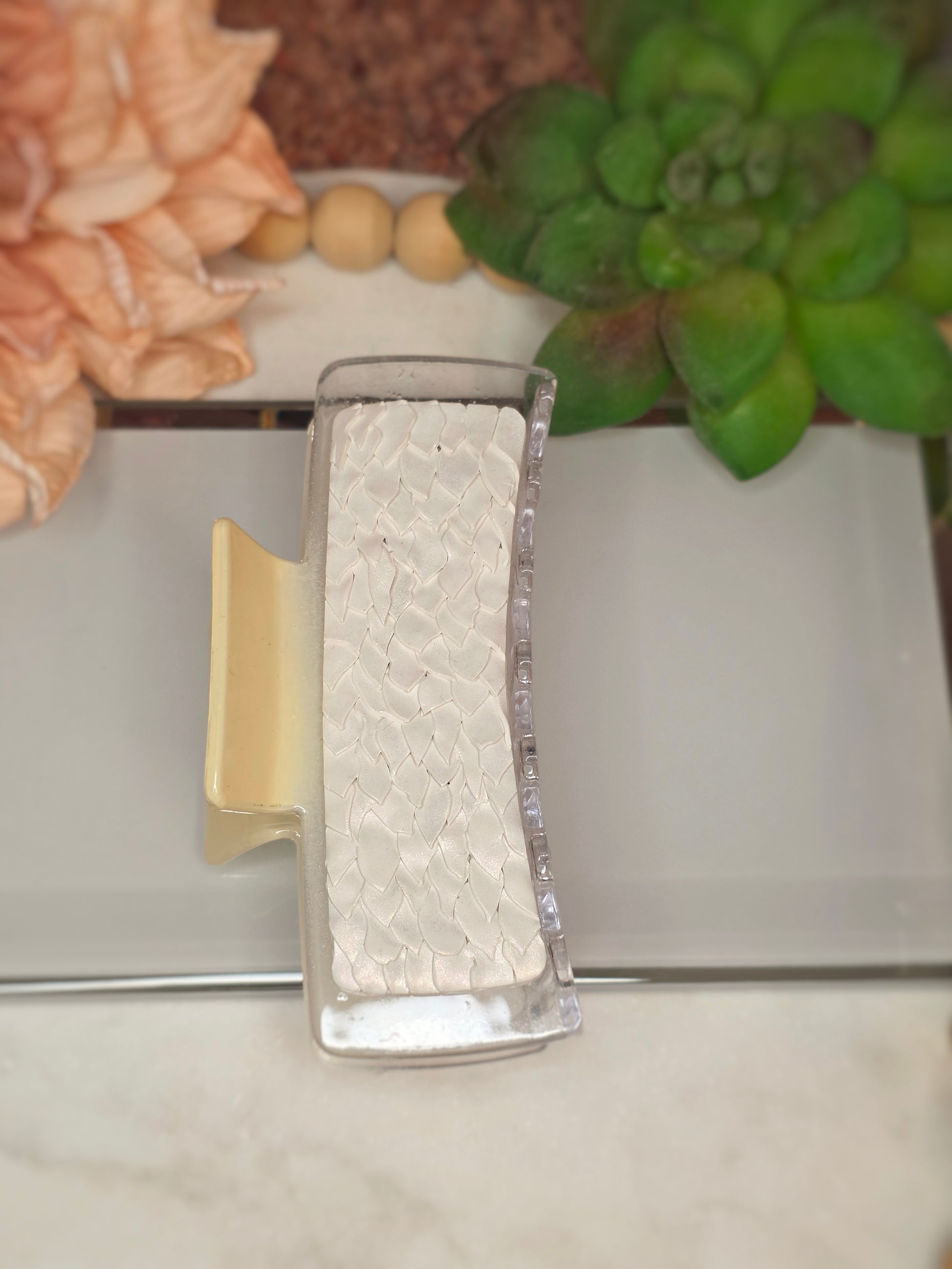 - Pearlescent White Scales on a Clear clip