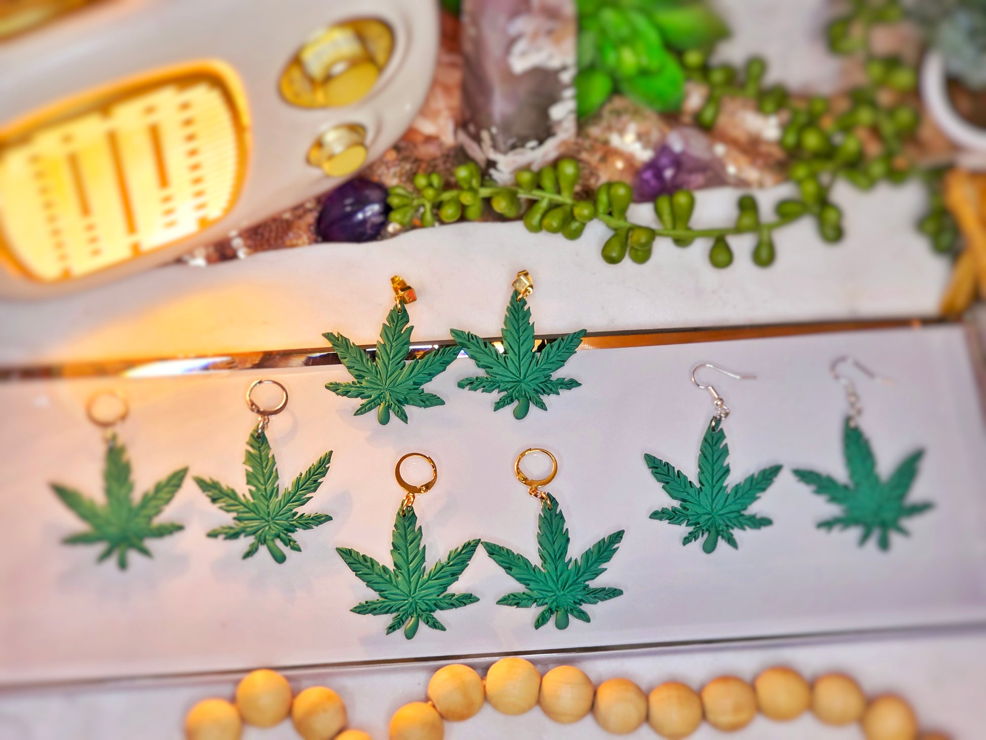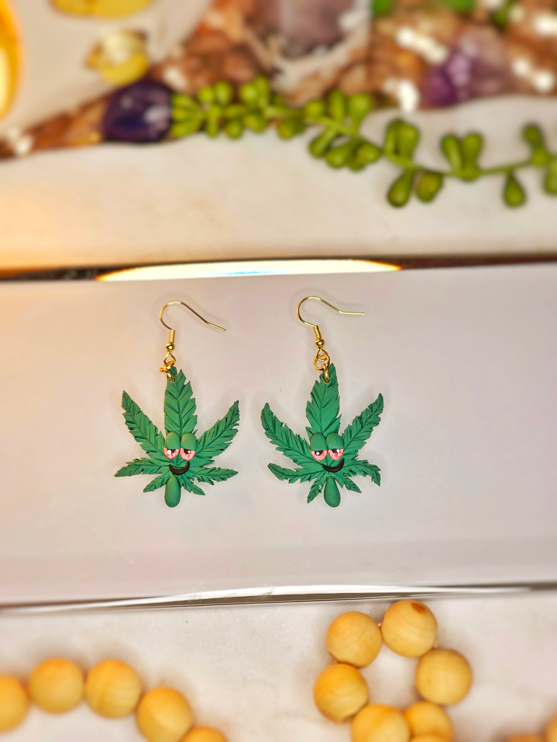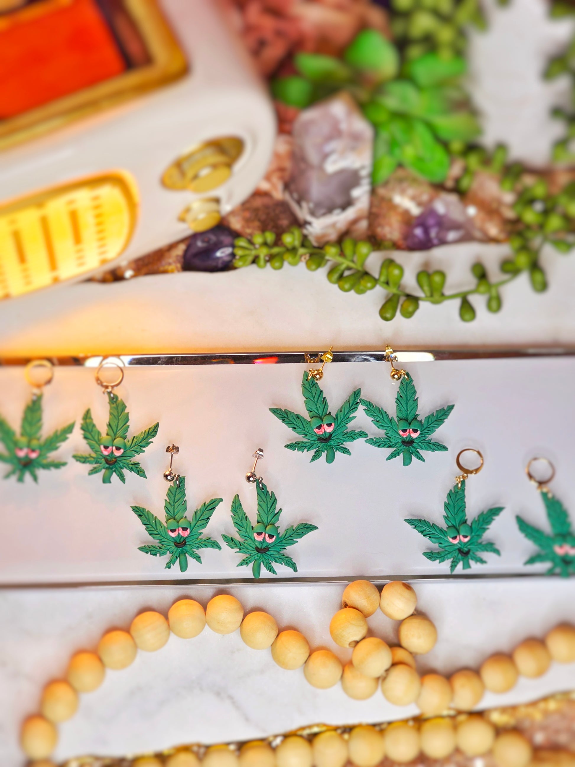 Show your love for the leaf with these fun and stylish cannabis dangle earrings. Handcrafted from lightweight polymer clay, each earring is detailed to look like the iconic leaf. This collection features multiple styles to match your vibe—choose from a classic, plain leaf for a subtle nod, or go for a playful look with our "cheeky" version featuring cute, red eyes.