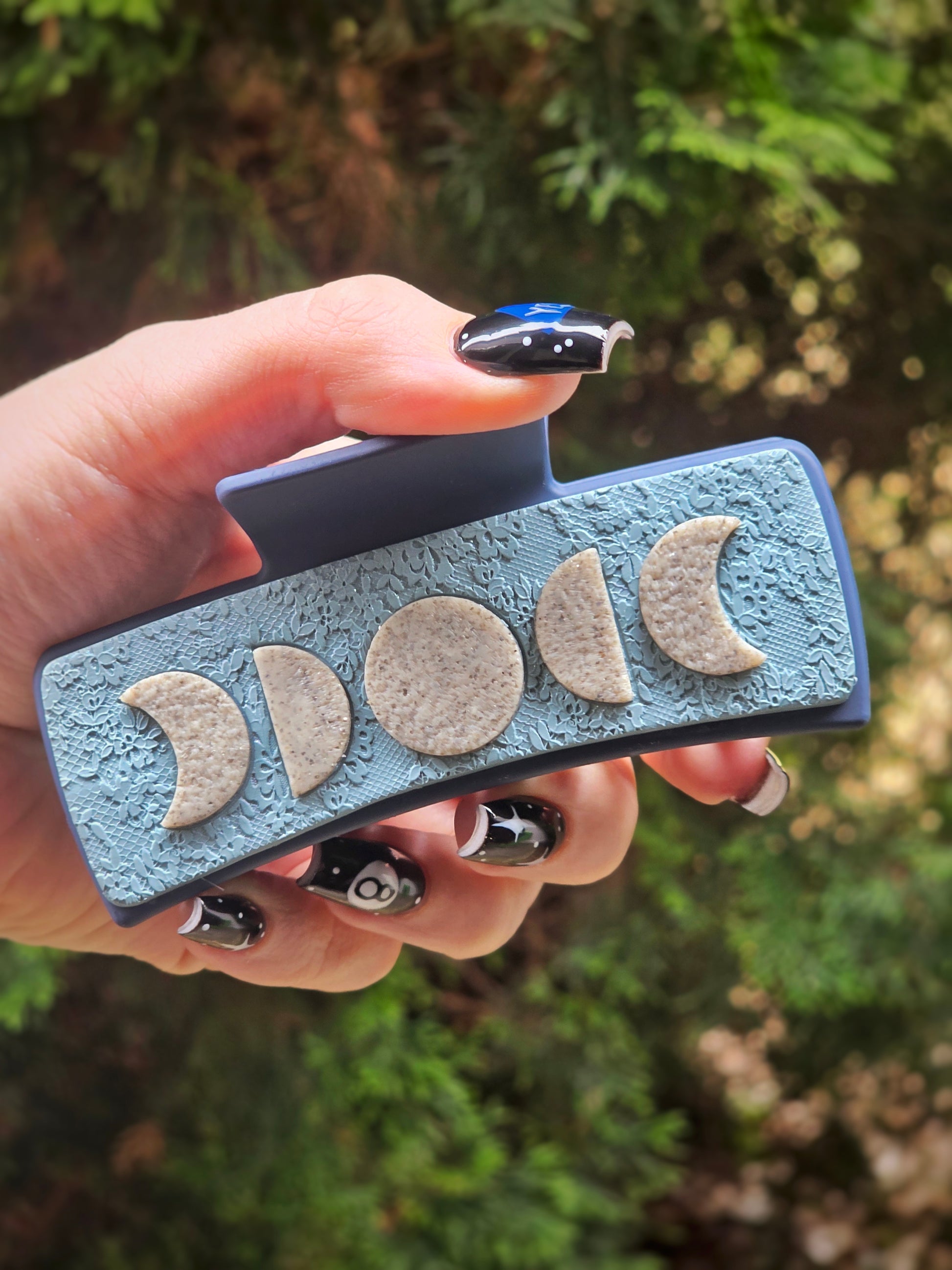 Embrace your inner goddess with our enchanting "Celestial Phases" claw clip. This unique accessory celebrates the mystic beauty of the moon, featuring a serene display of moon phases that will add an ethereal touch to any hairstyle.