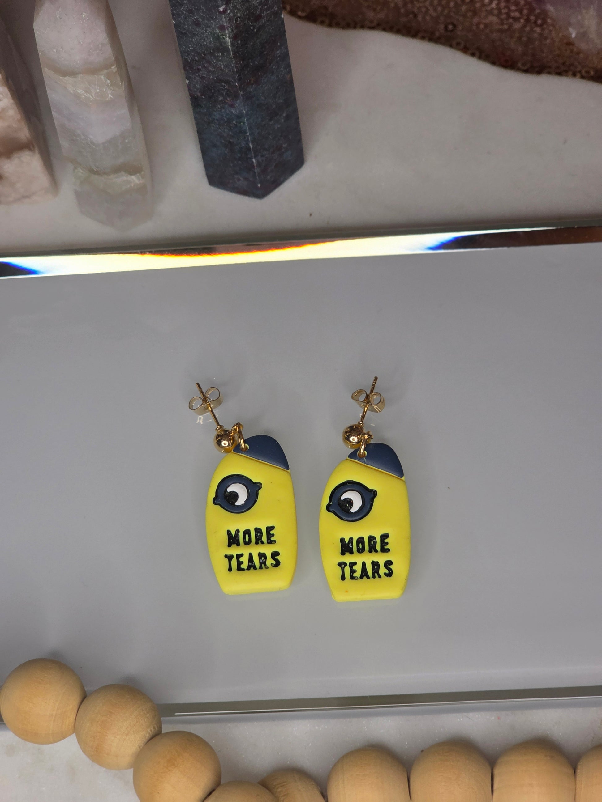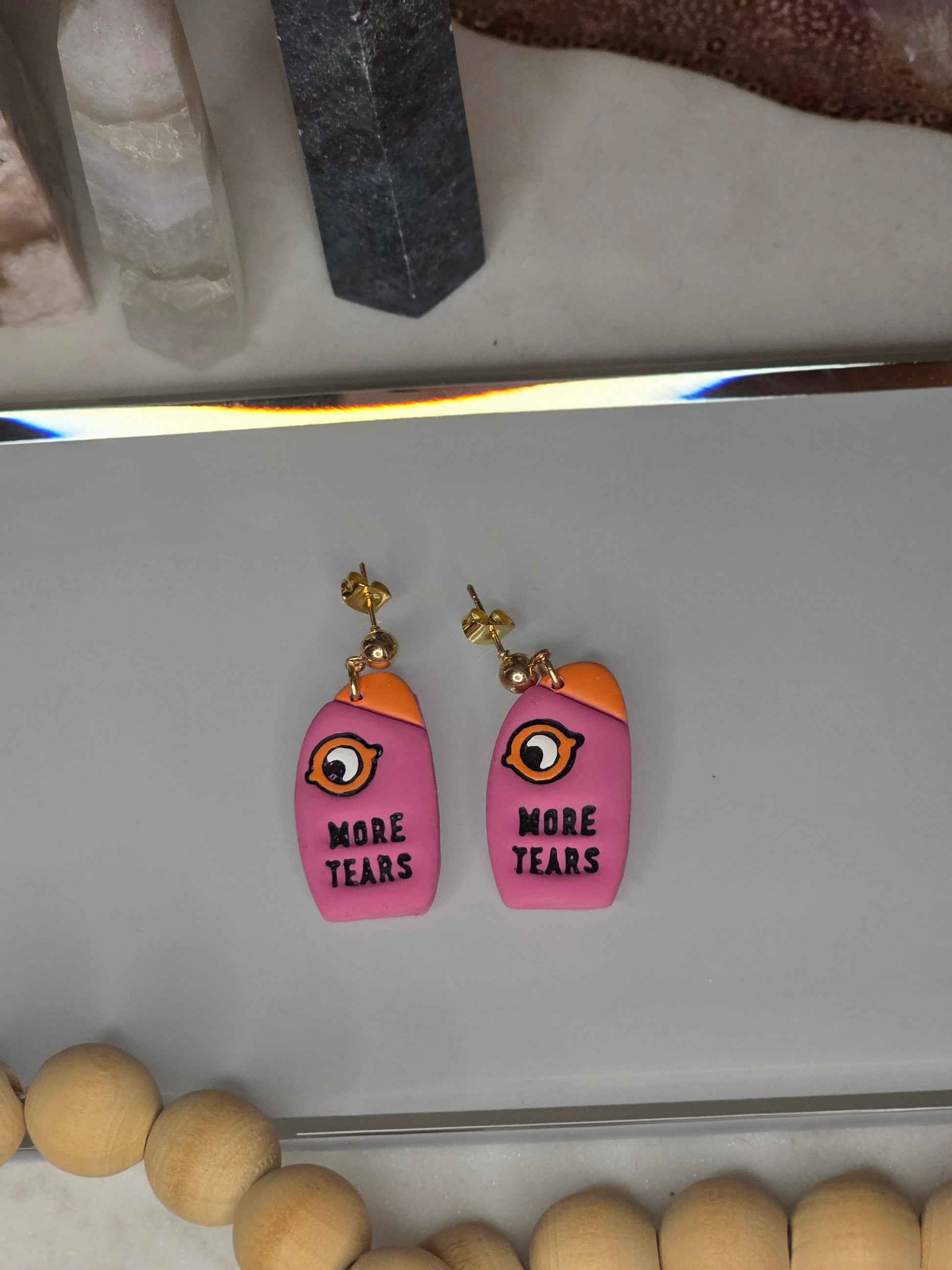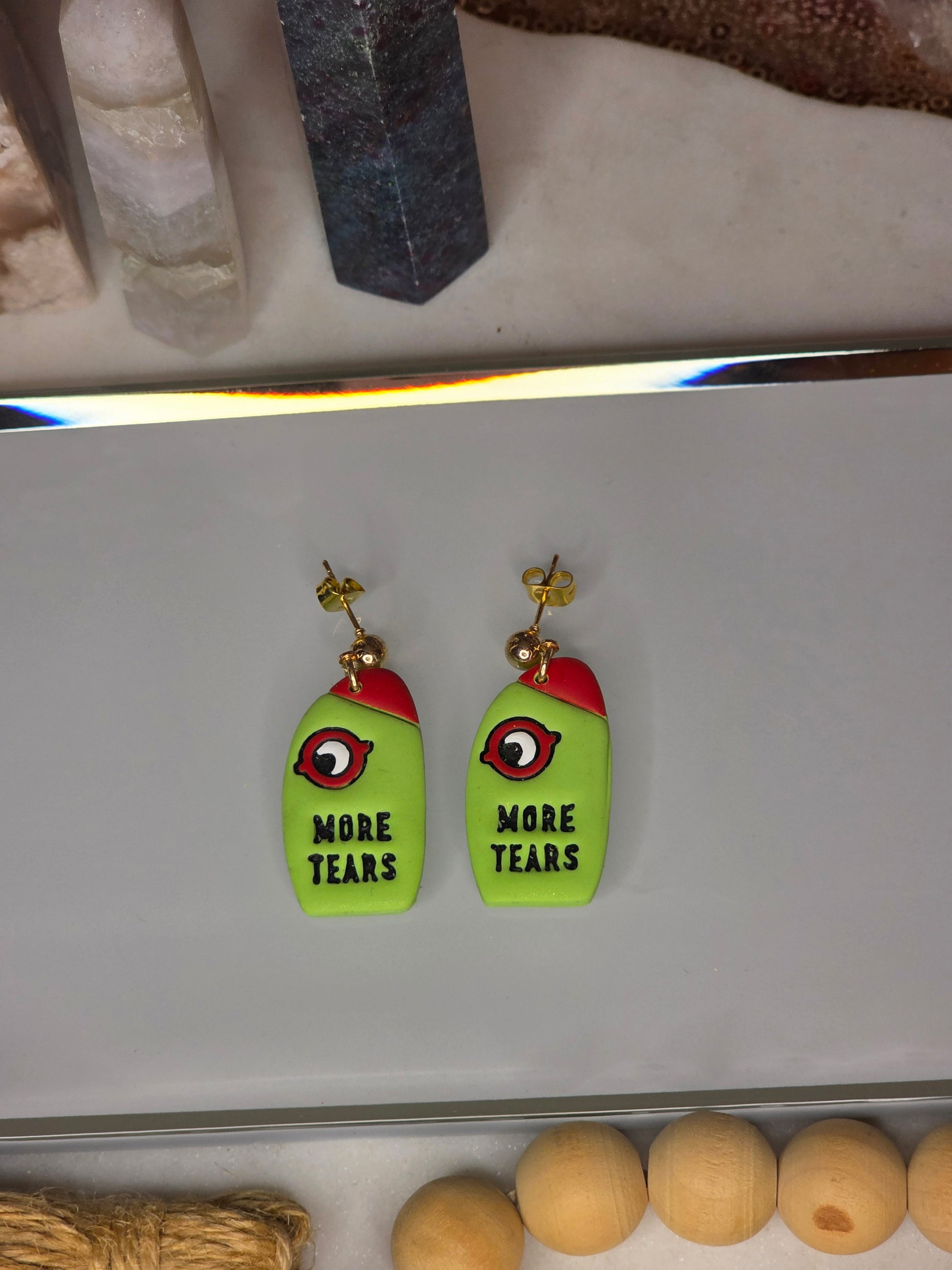 Get ready to turn heads and spark some conversations! These aren't your average earrings—they're tiny pieces of wearable art with a playful, cheeky attitude. Each pair of our "More Tears" earrings is lovingly crafted by hand from super lightweight polymer clay, so you can make a bold statement without any of the weight. The whimsical eye and the sassy "More Tears" message are perfect for anyone who loves a bit of drama and a lot of style.