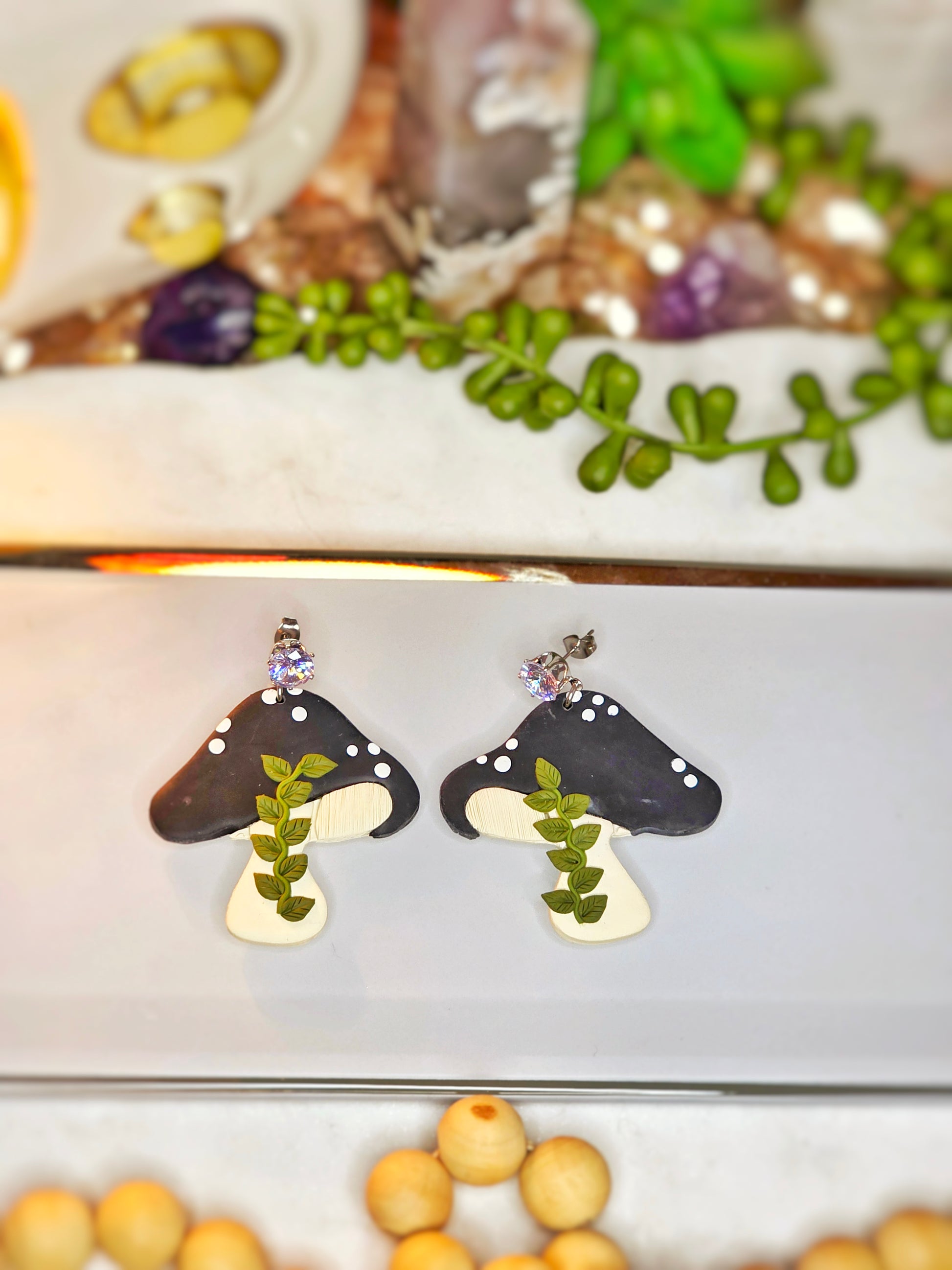 Step into a magical woodland with these enchanting, vine-wrapped mushroom earrings. Lovingly handcrafted from lightweight polymer clay, each toadstool features a dark, speckled cap and a delicate green vine climbing its stem. Finished with a sparkling crystal stud, these dangles are the perfect accessory for any lover of cottagecore, fairy tales, and the magic of nature.