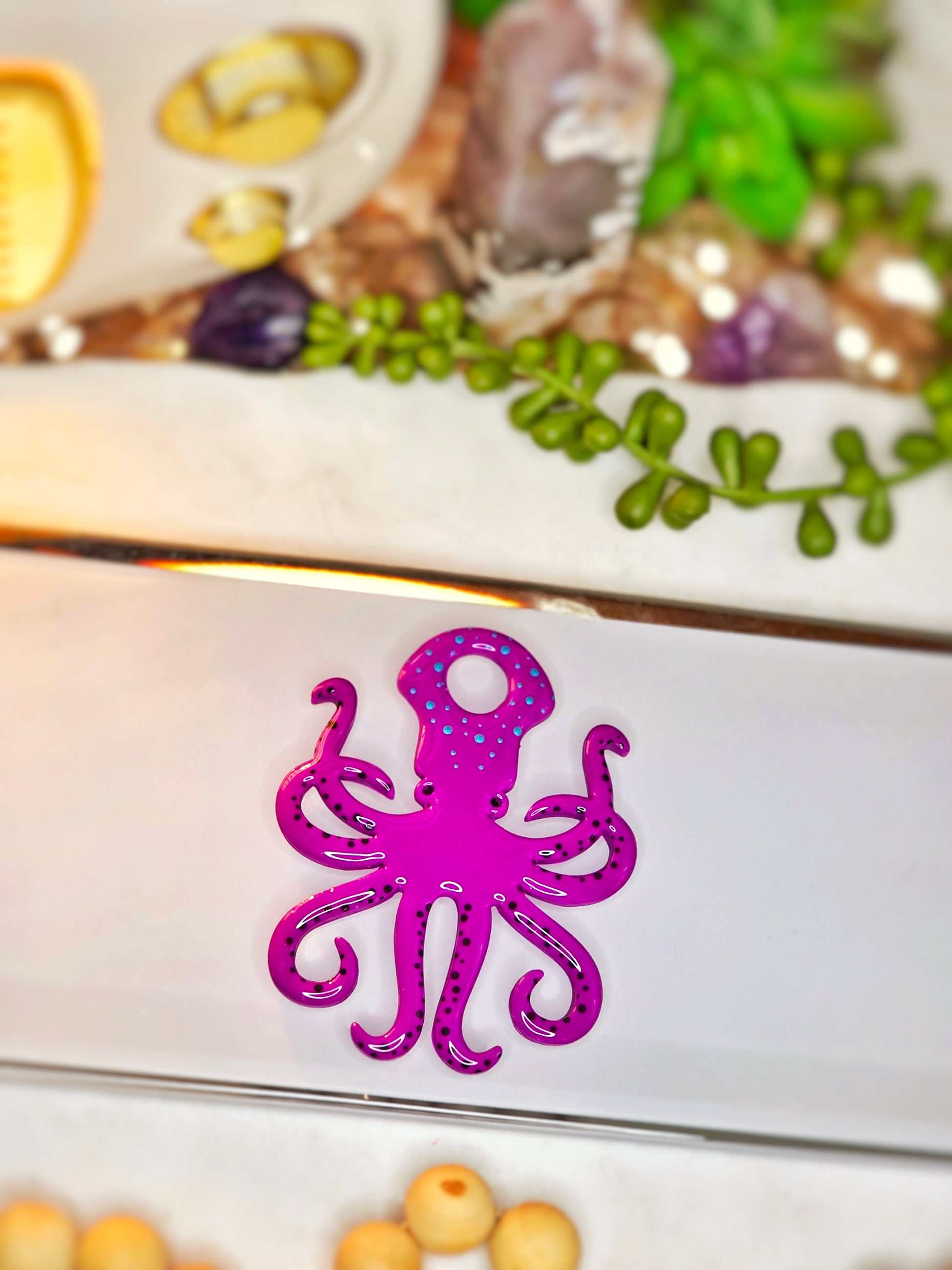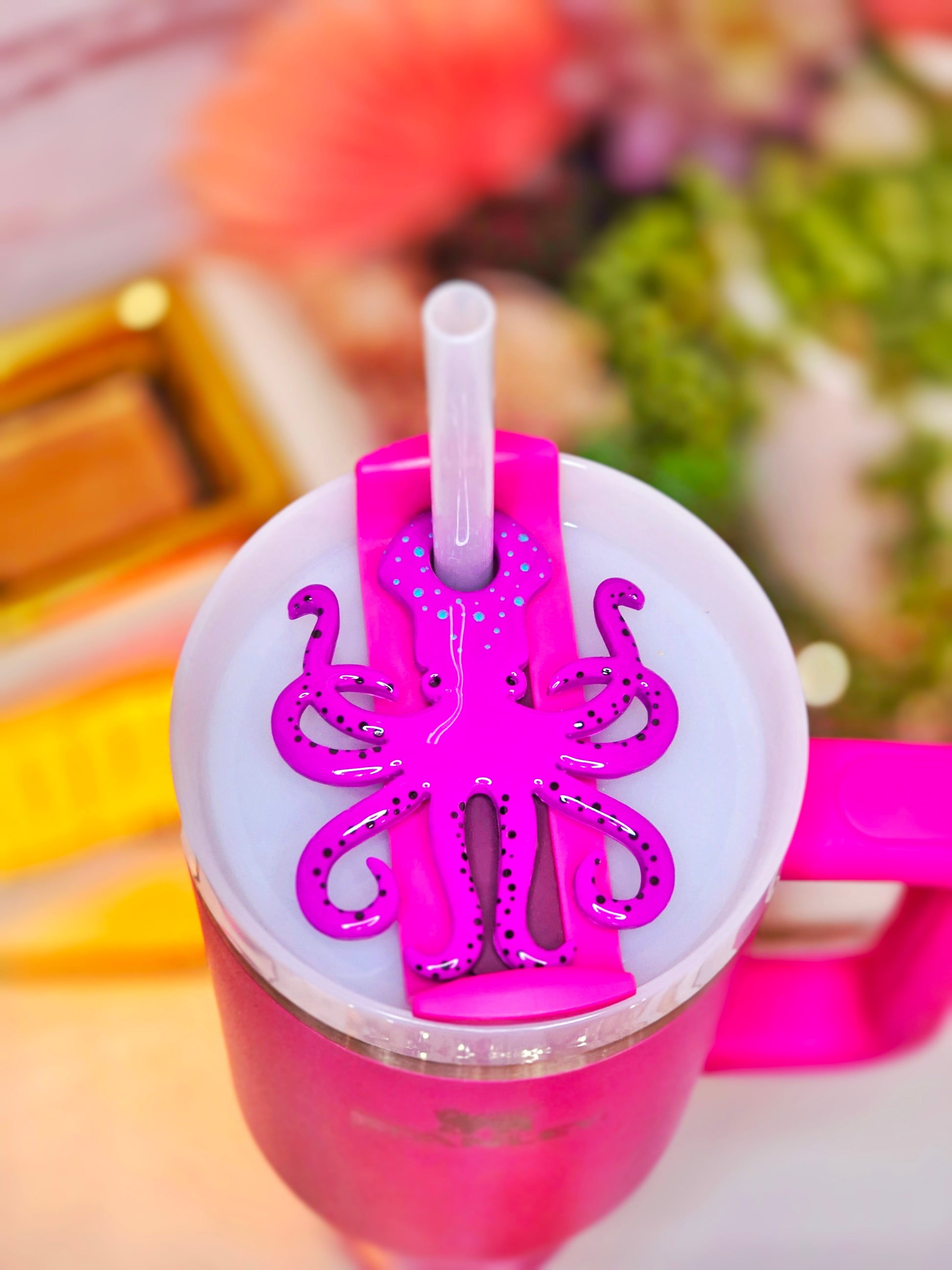 This adorable octopus is crafted from a vibrant, shimmering magenta material packed with mesmerizing glitter that catches the light with every sip. It's designed to sit perfectly on your tumbler lid, securing your straw and making your drinkware stand out from the crowd.