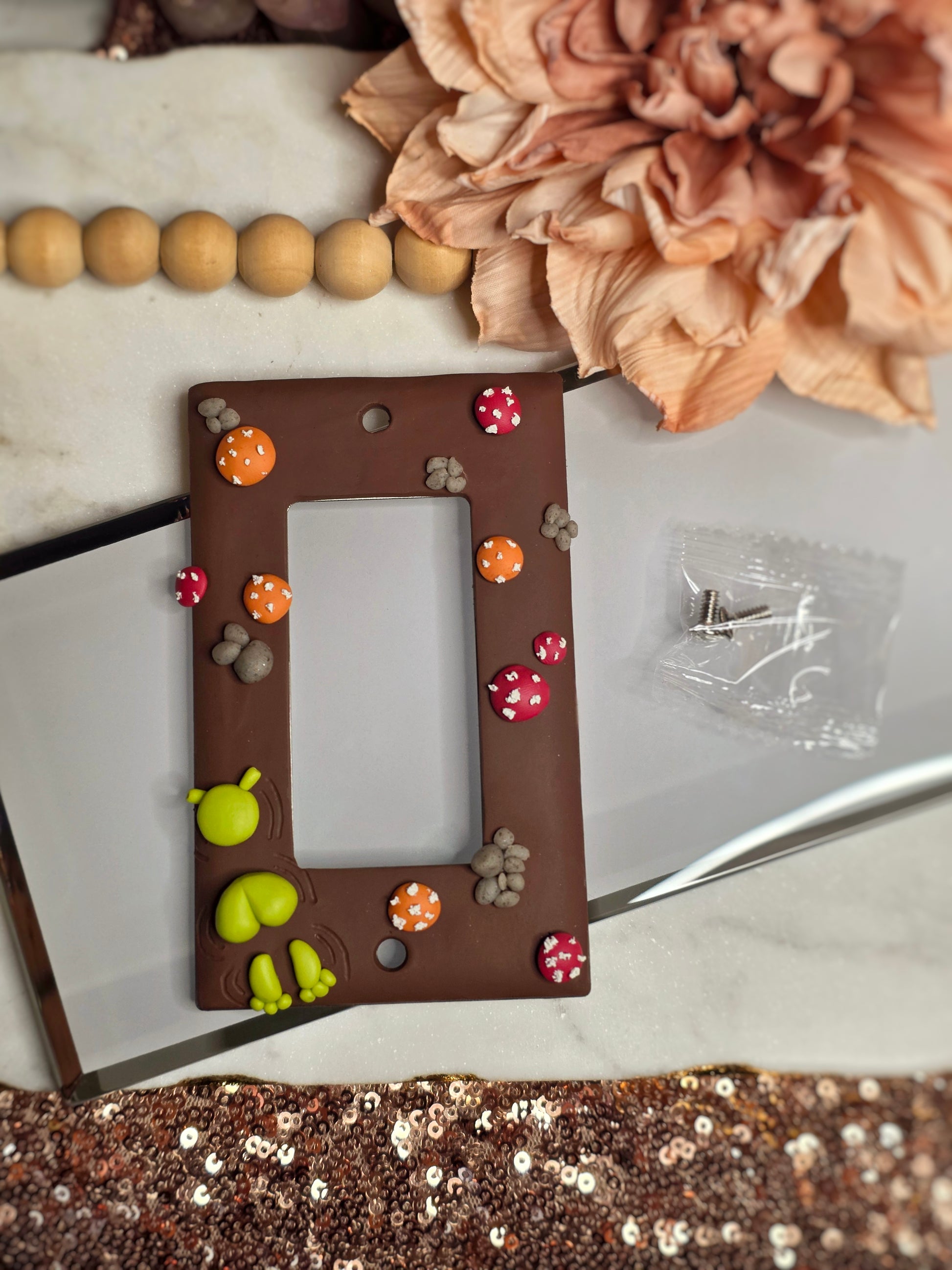 Carefully hand-sculpted from polymer clay, this cover captures the magic of a fairytale swamp. It features a rich, muddy brown base adorned with colorful mushrooms, swampy pebbles, and, of course, a peek of the iconic green ogre himself hiding in the corner. It's the perfect, quirky detail to add a touch of personality and fun to a bedroom, playroom, or any space that needs a little enchantment.