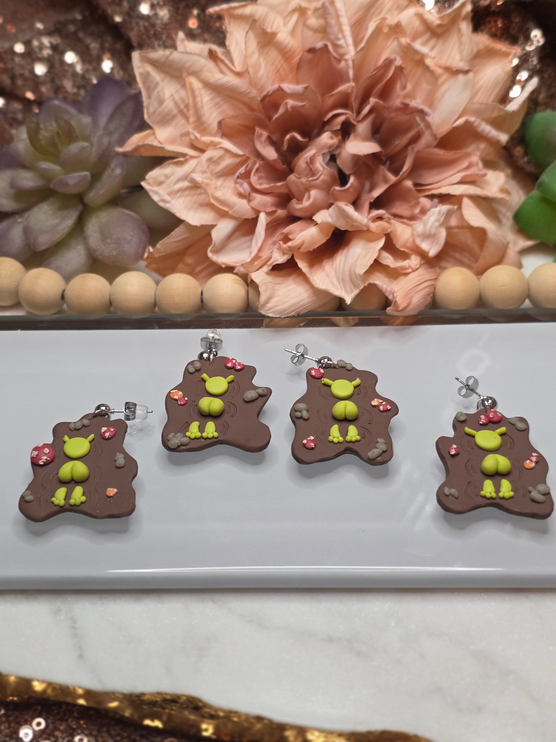 Handcrafted with incredible detail from high-quality polymer clay, each earring captures the magic of a fairytale swamp. The design features a cheeky green ogre bottom popping out of a textured mud puddle, which is adorned with tiny, whimsical mushrooms. These lightweight dangles are attached to hypoallergenic surgical steel posts, making them a comfortable and fun accessory for everyday wear or a trip to a faraway land.