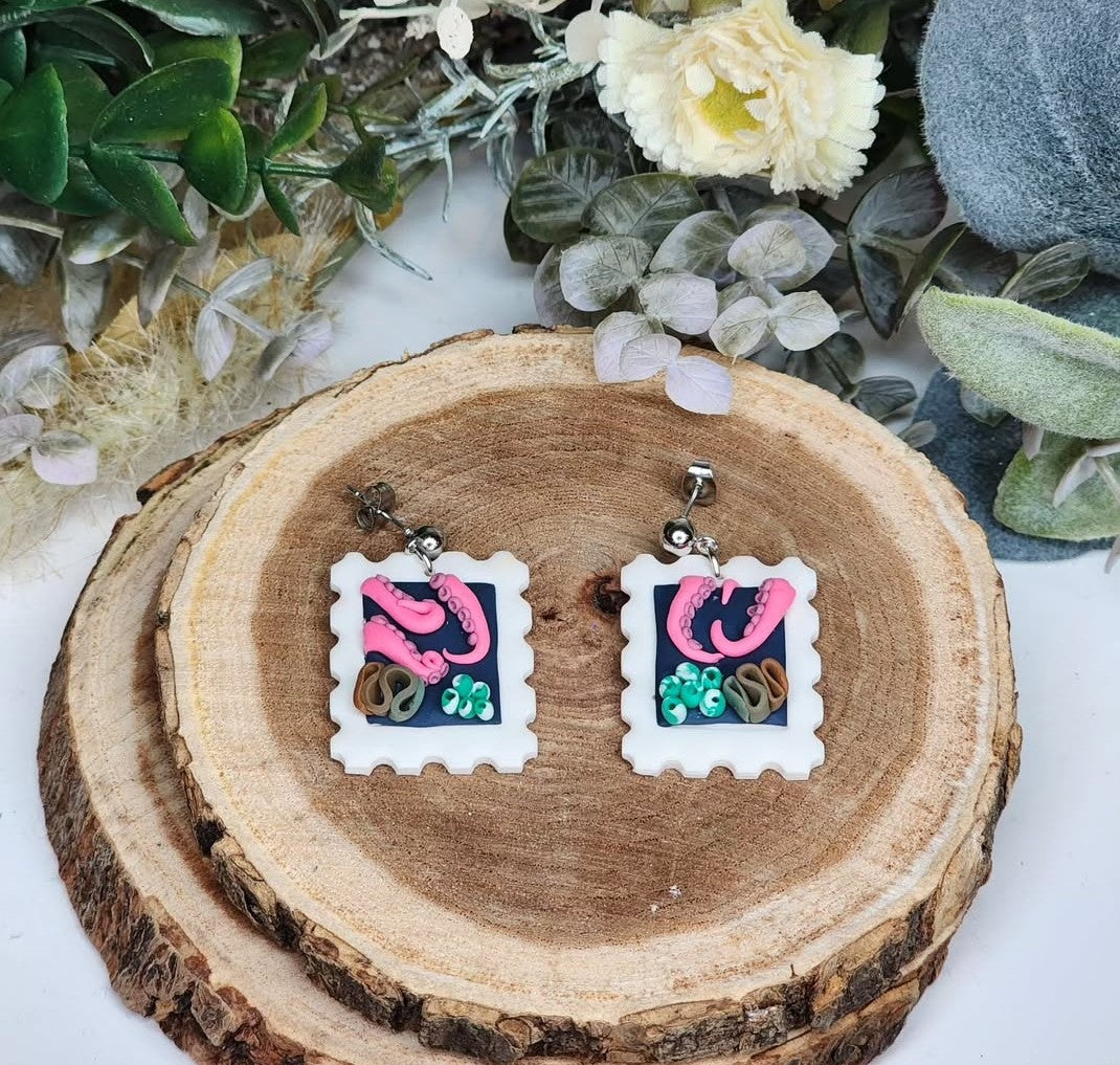 Dive into whimsical charm with our "Ocean Mail" Octopus Stamp earrings! These aren't just earrings; they're miniature works of art, each lovingly handmade to bring a splash of the deep sea to your everyday style. Imagine a curious pink octopus tentacle playfully reaching out from a tiny, detailed postage stamp – that's the magic captured in these lightweight polymer clay beauties. They're perfect for ocean lovers, free spirits, or anyone who wants to add a truly unique and conversation-starting accessory to their collection.