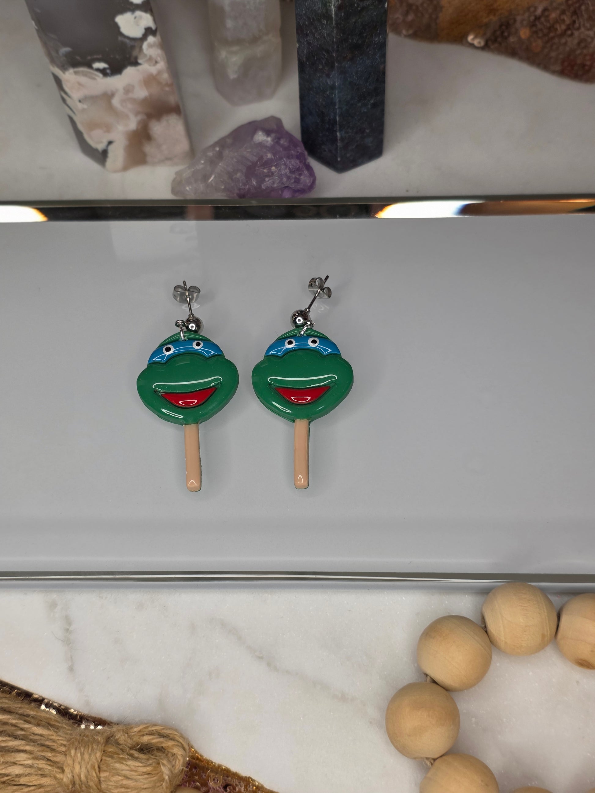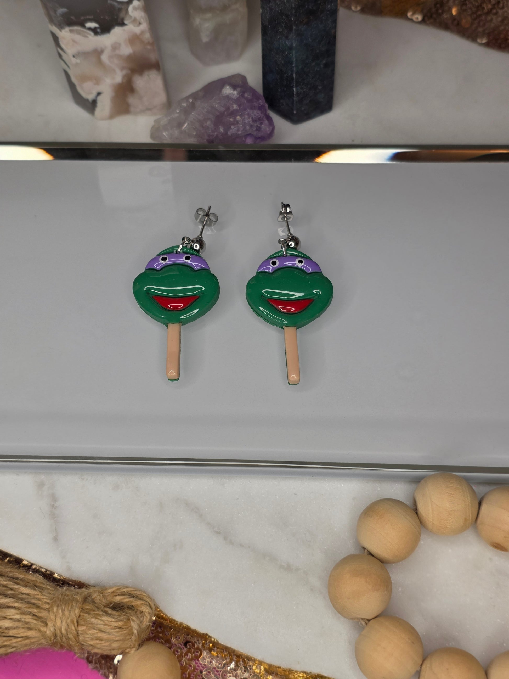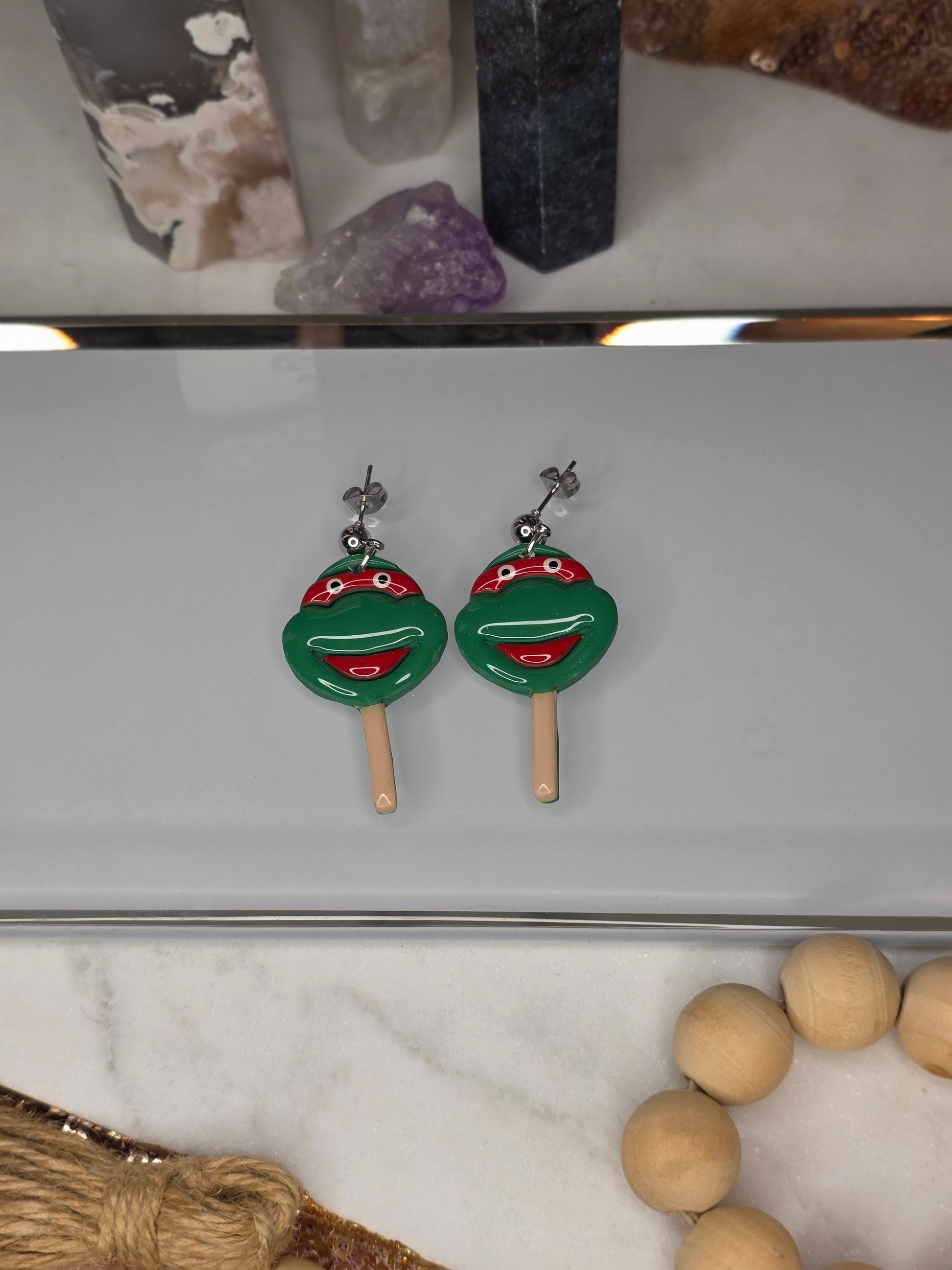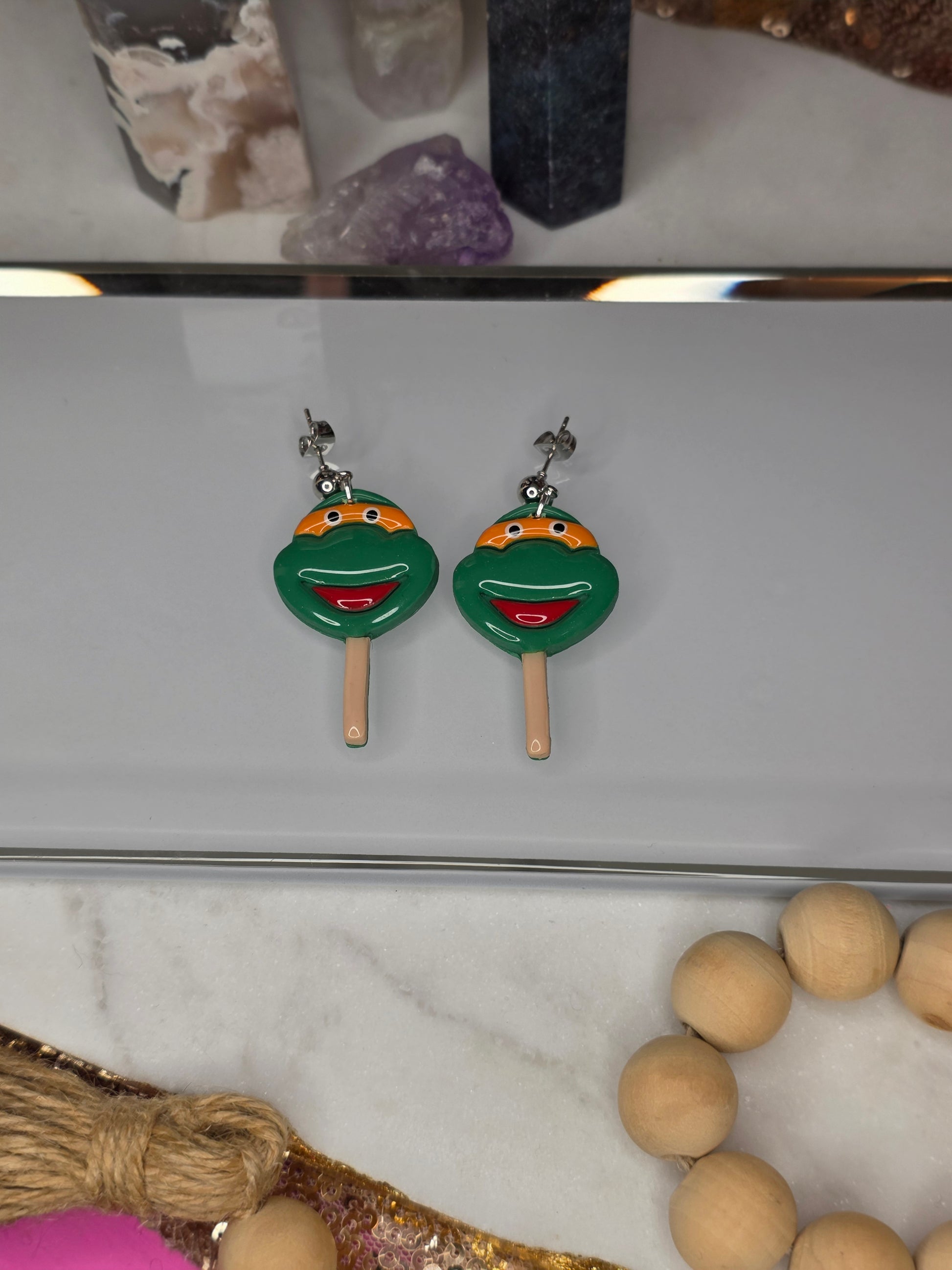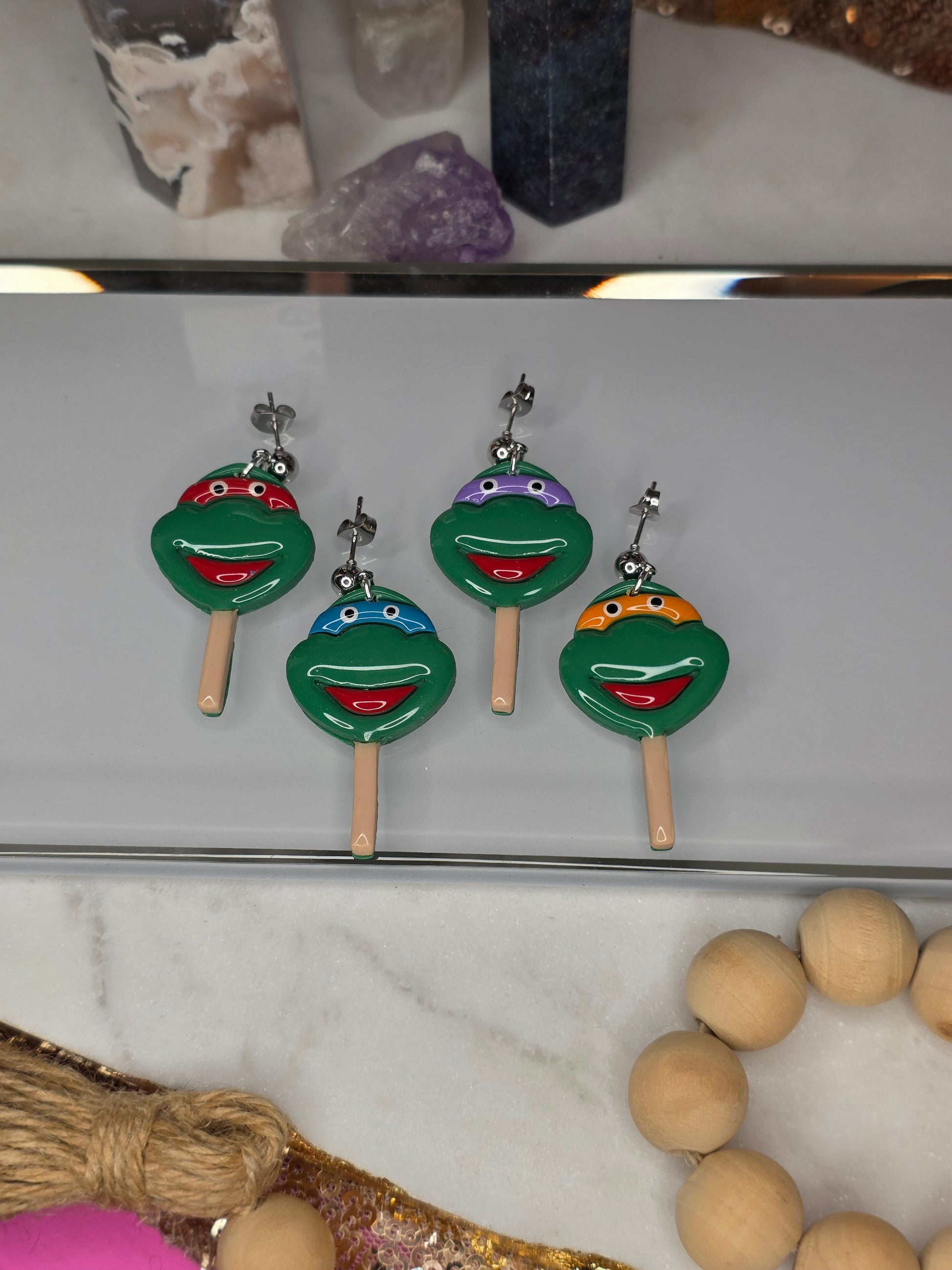 Unleash your inner hero with this totally awesome collection of handmade popsicle earrings! Inspired by the classic ice cream truck treat, this set is a perfect dose of 90s nostalgia. Each pair is meticulously handcrafted from polymer clay to capture the iconic look of the Teenage Mutant Ninja Turtles, complete with their signature colored masks.